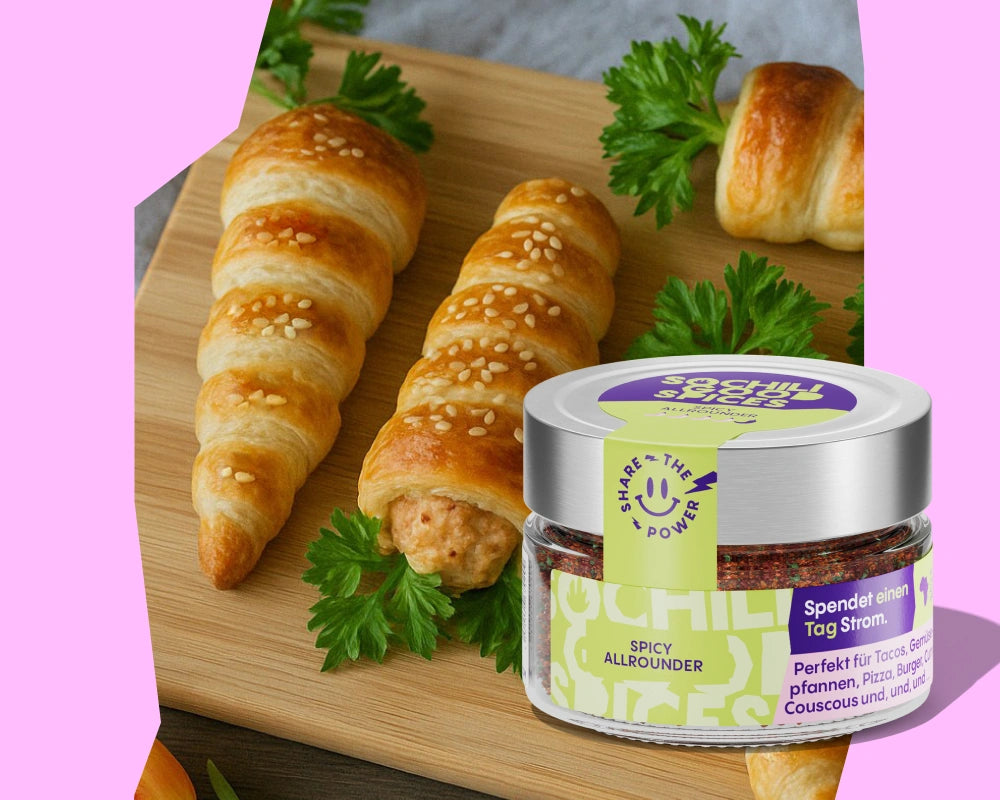 Blätterteig in Streifen schneiden und spitz zulaufend aufrollen. Mit Milch oder Eigelb bestreichen und nach Belieben mit Sesam, Schwarzkümmel oder Chiliflocken toppen. Bei 180 °C Umluft ca. 15 Minuten backen, bis sie goldbraun und knusprig sind.