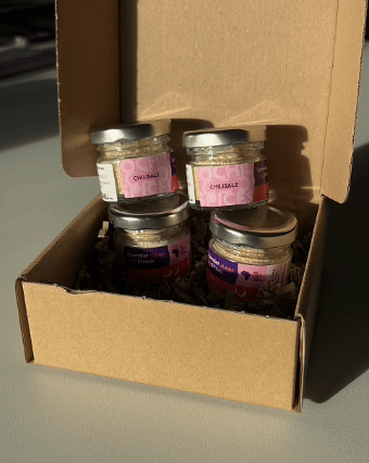 Alle vier Mini Chilisalze verpackt in einem kleinen Karton, perfekt zum verschenken.